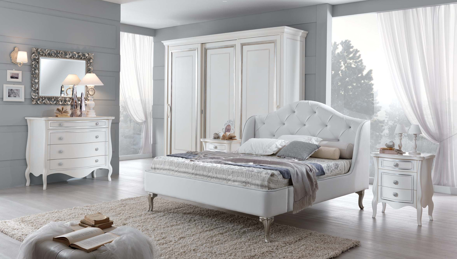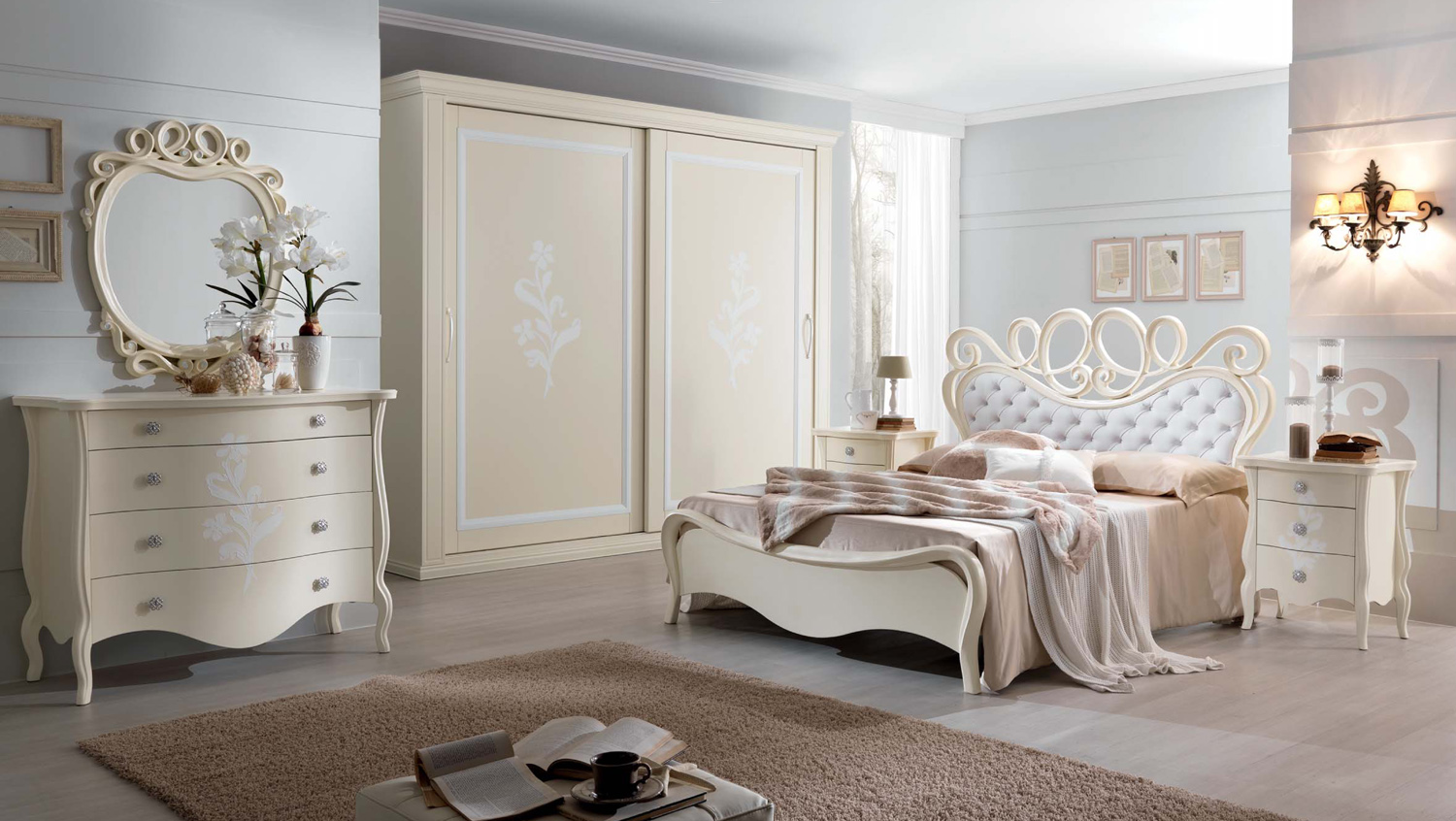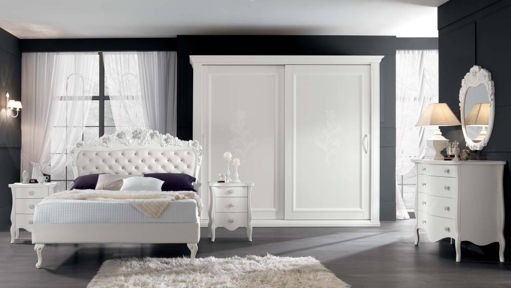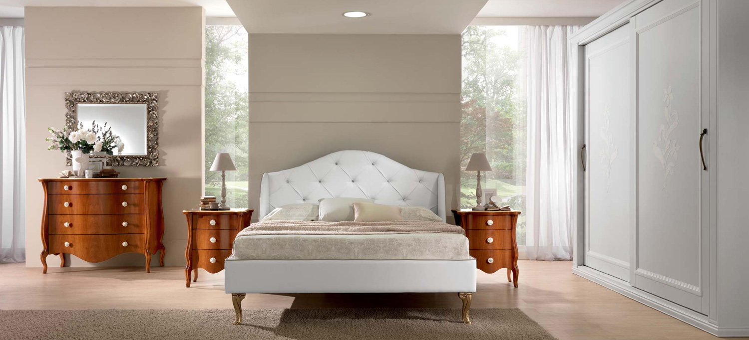 Trittico Mod. Leopardi costruito interamente in legno massello con guide “blumotion” con pomoli in ceramica o in ottone/argento. Presentato nelle versioni Laccato Bianco Antico a mano con particolari Foglia Argento, (Campione colore N.10), Laccato Beige opaco, Bianco Opaco a mano con particolare fiore bianco decorato a mano, (Campione colore N. 11), in noce nazionale con particolari foglia oro.