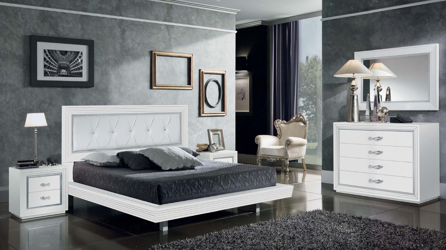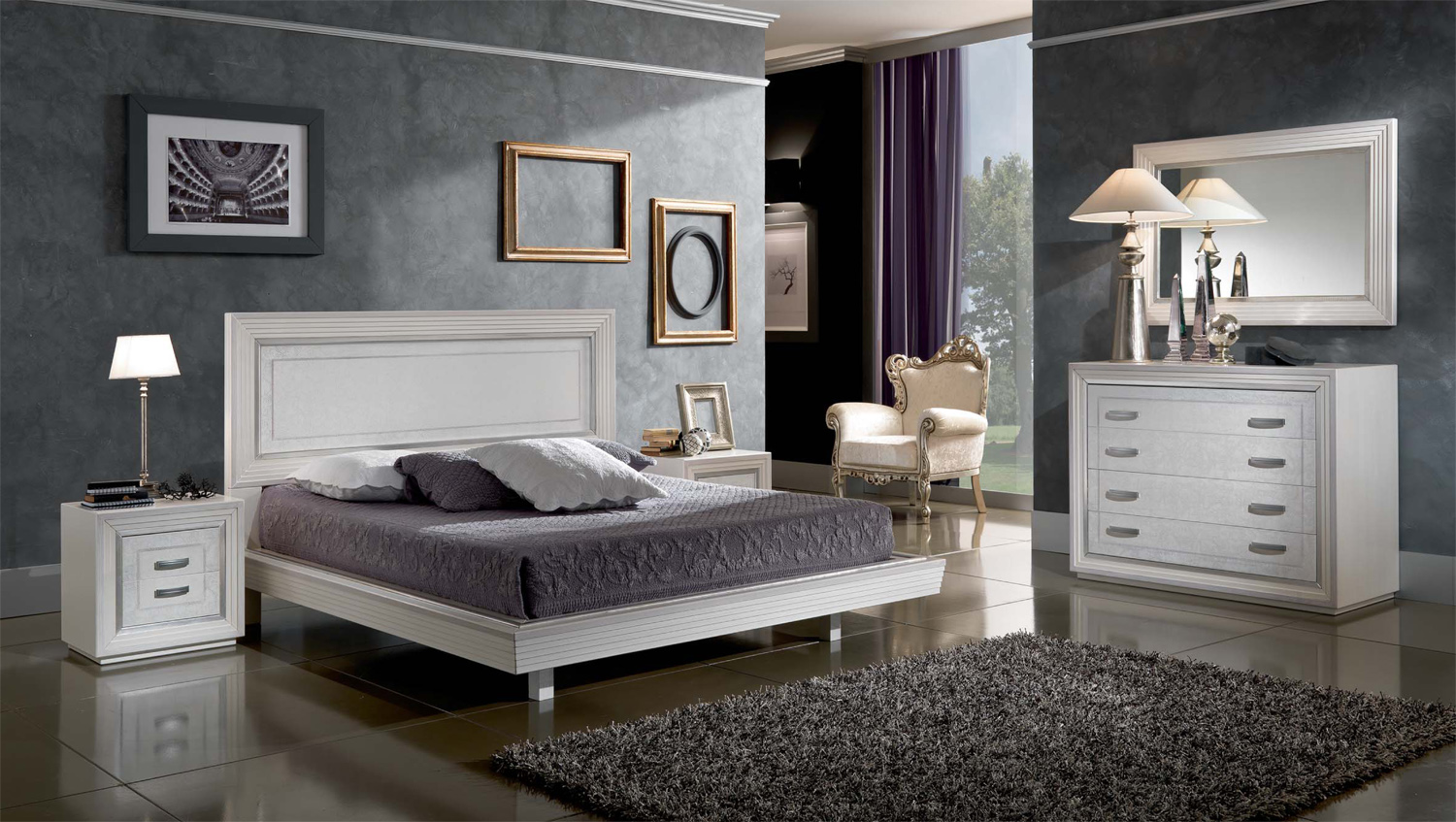 Armadio 2 Ante Scorrevole interamente in tamburato con pregiato decoro eseguito a mano, nelle versioni patinato rigato Bianco finitura damascato madreperla o laccato bianco opaco con cornici rivestite in Foglia Argento.